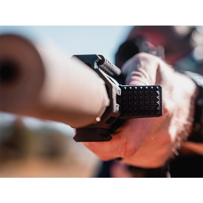 El Barricade Stop está construido con un cuerpo de polímero que cuenta con una placa de acero endurecido tratada con QPQ. La placa de acero está fuertemente texturizada para un contacto agresivo con el descanso de tiro. Además, está ligeramente curvada para un contacto optimizado en superficies irregulares, lo que le permite pivotar su arma mientras mantiene el contacto y el control.