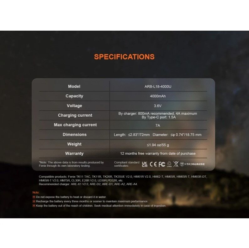 La batería recargable Fenix 18650 de 4000 mAh (ARB-L18-4000) es una de las más avanzadas del mercado, ofreciendo la mayor capacidad disponible. Las baterías Li-ion en formato 18650 son ideales para almacenar energía de manera eficiente debido a su tamaño y peso.