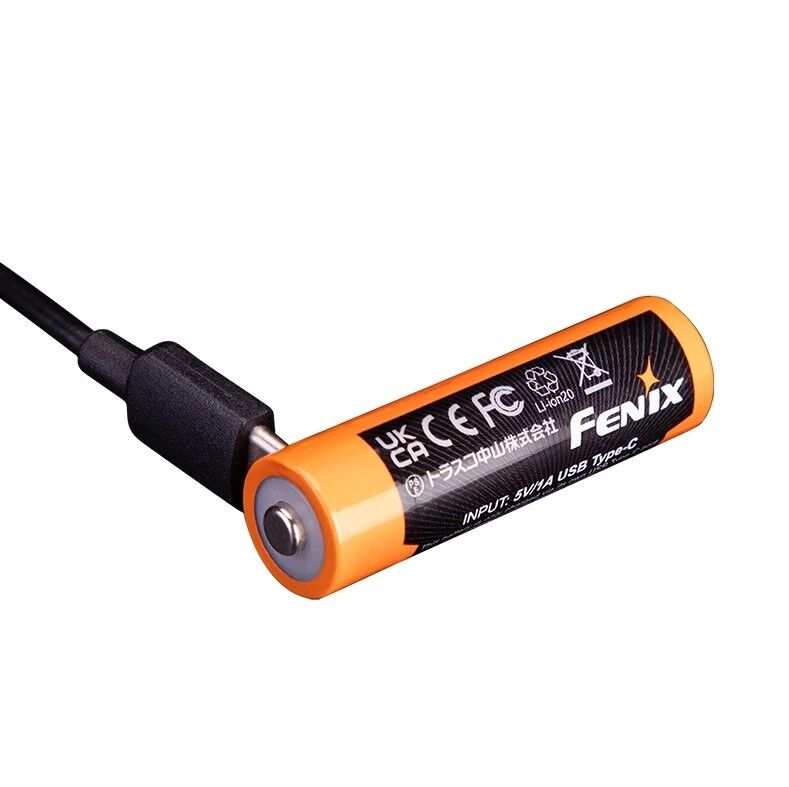 La batería se carga exclusivamente a través del conector USB-C incorporado, lo que permite recargarla desde una computadora, un cargador de teléfono móvil, un banco de energía u otra fuente USB. No se puede cargar en cargadores convencionales. Además, cuenta con protección integrada contra la descarga completa y cortocircuitos (la corriente de descarga continua máxima es de aproximadamente 1,6 A). Esto la hace ideal para cámaras, sistemas de navegación, equipos de laboratorio y otros dispositivos. Es compatible con linternas y frontales Fenix como los modelos HL23, HL50, E12, E20, LD12 y LD22, pero no es compatible con los modelos HM23, LD41 y LD42 debido a sus altas demandas de corriente en el modo más potente.