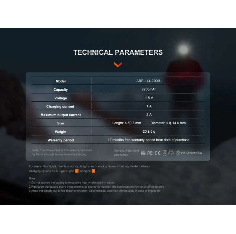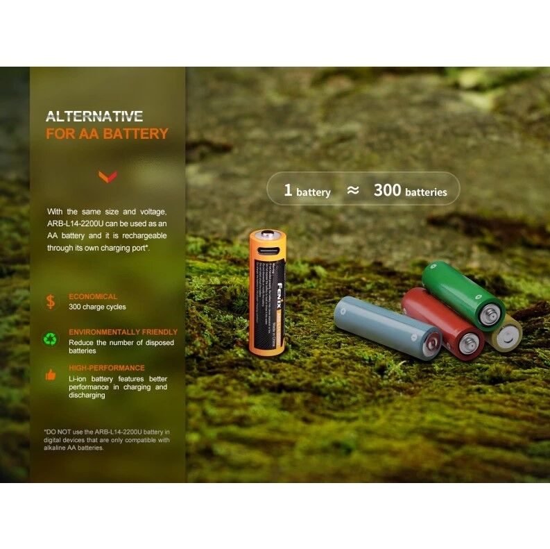 La batería recargable Fenix ARB-L14-2200U es una alternativa moderna a las baterías clásicas AA. En su interior cuenta con una celda de ion de litio equipada con electrónica de regulación que mantiene un voltaje de salida constante de 1,5 V durante la descarga. Por ello, es particularmente adecuada para dispositivos sensibles a los niveles de voltaje que, por ejemplo, no funcionan correctamente con baterías recargables NiMH o solo lo hacen durante un tiempo limitado. Su capacidad es de 2200 mAh (3,3 Wh, lo que equivale a 3000 mAh en baterías NiMH).