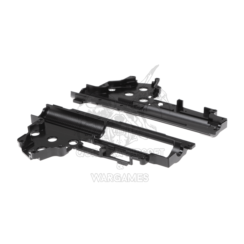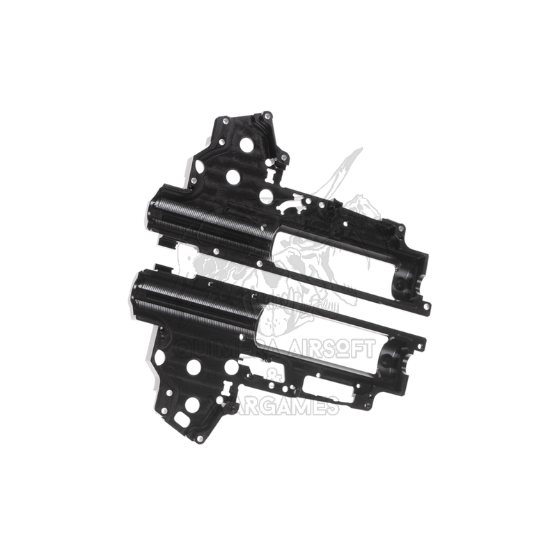 El uso de rodamientos de 8mm en los agujeros del gearbox proporciona una mejor eficiencia y menor fricción, lo que contribuye a un funcionamiento más suave y eficaz. Además, esta carcasa de gearbox está diseñada con el sistema Quick Spring Change (QSC), lo que permite cambiar el muelle rápidamente sin desmontar todo el gearbox.