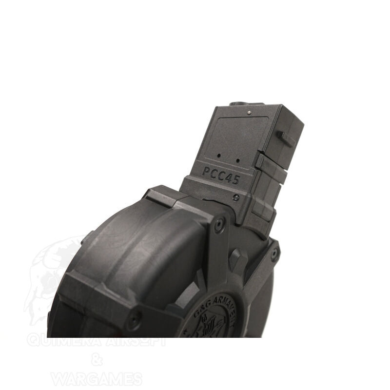 Fabricado en polímero reforzado de alta resistencia, combina ligereza y durabilidad, con un diseño compacto que se adapta perfectamente a la plataforma PCC45. Su sistema de alimentación manual mediante rueda permite tensar el muelle de forma sencilla, asegurando un suministro estable y fiable de BBs en cada ráfaga.