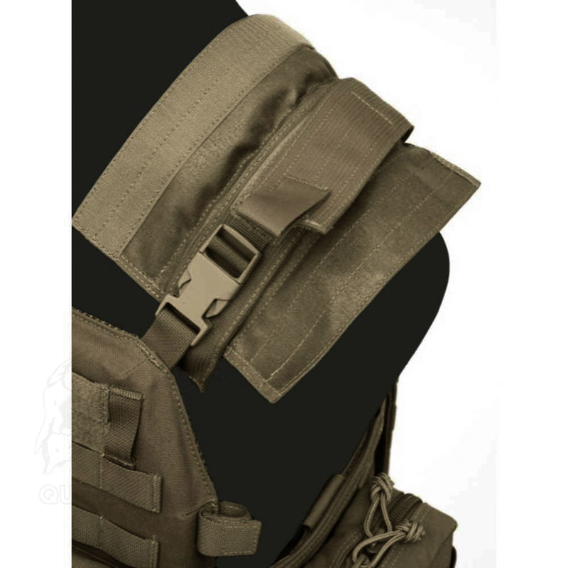 El chaleco cuenta con un diseño modular que permite la personalización según las necesidades del usuario. Está equipado con múltiples puntos de fijación MOLLE en la parte delantera, trasera y lateral, lo que permite la adición de pouches y accesorios compatibles para llevar todo el equipo necesario. El DCS Plate Carrier Base Warrior tiene un sistema de ajuste ergonómico que garantiza un ajuste seguro y cómodo para diferentes tamaños de cuerpo. Los tirantes acolchados y la cintura ajustable ofrecen soporte adicional y distribuyen el peso de manera equitativa, reduciendo la fatiga durante largos períodos de uso. El chaleco cuenta con bolsillos internos para placas balísticas, lo que permite la inserción de placas de protección para mayor seguridad. También tiene un sistema de liberación rápida que permite una extracción rápida en situaciones de emergencia.