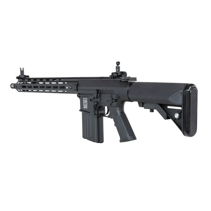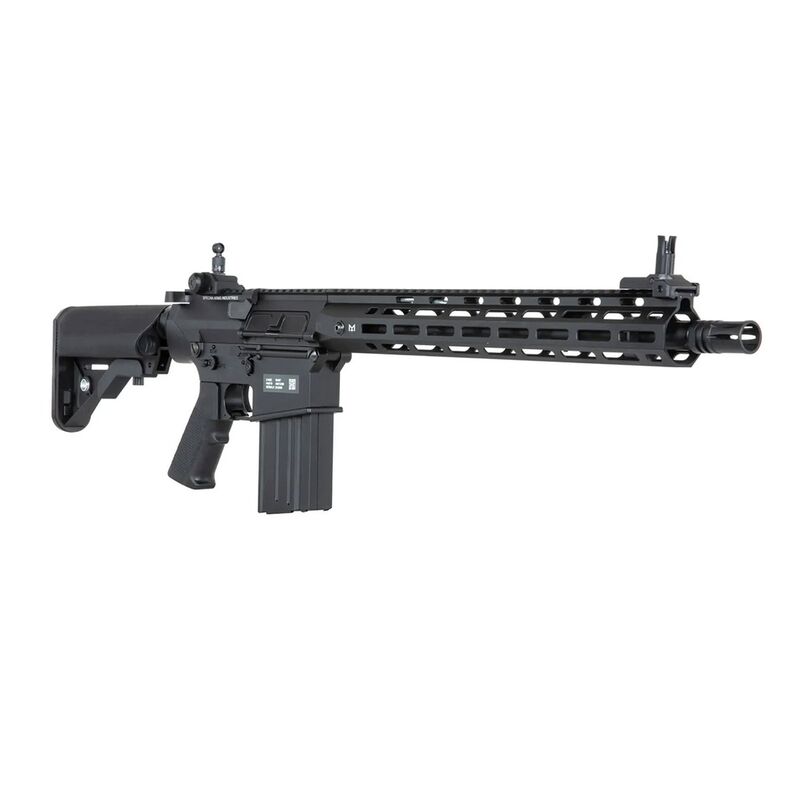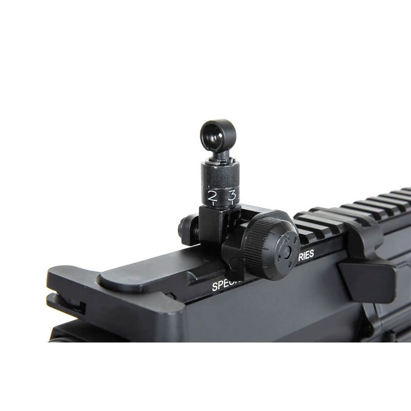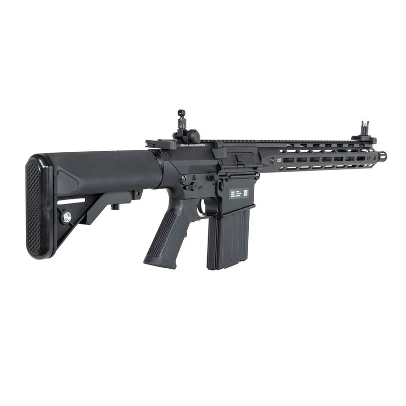 El SR-25 cuenta con controles completamente ambidiestros, incluyendo un bolt-catch funcional en ambos lados. El acceso al hop-up se realiza tirando de la palanca de carga, permitiendo ajustes precisos para optimizar la trayectoria de la munición en distintas condiciones. Esta versión está equipada con un guardamanos moderno M-LOK y una culata ajustable en cinco posiciones. La batería se aloja en la culata y se conecta mediante un conector T-Deans. En la parte superior del cuerpo hay una mira trasera abatible y un riel Picatinny de 22 mm para la instalación de ópticas. La réplica viene con dos cargadores mid-cap de 70 BB con carcasa de acero. Aunque la capacidad puede parecer baja, este modelo no está diseñado para disparar en ráfagas continuas. El cañón interno de 6.03 mm de precisión, ya probado en la serie Edge de Specna Arms, cuenta con una rosca de 14 mm CCW en el cañón externo, permitiendo la instalación de silenciadores o unidades tracer. De fábrica, el rifle permite disparos en modo semiautomático, automático y programable, con la opción de bloquearlo en modo semiautomático mediante el ETU. Su peso es similar al del arma real gracias a los materiales de alta calidad utilizados en su construcción.