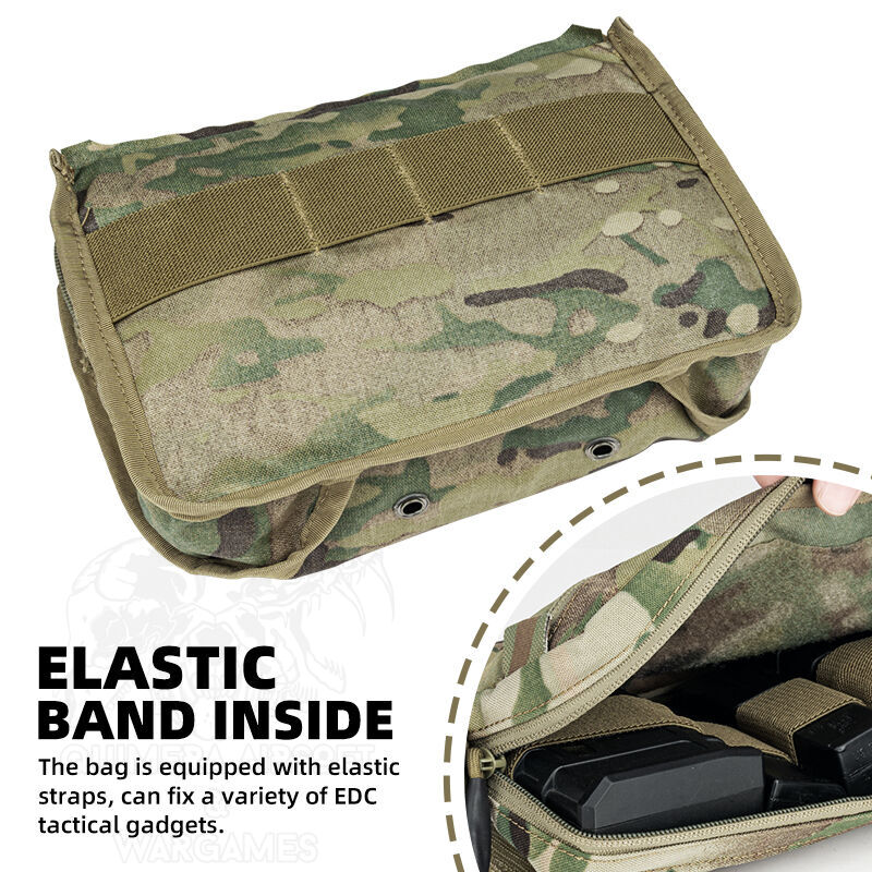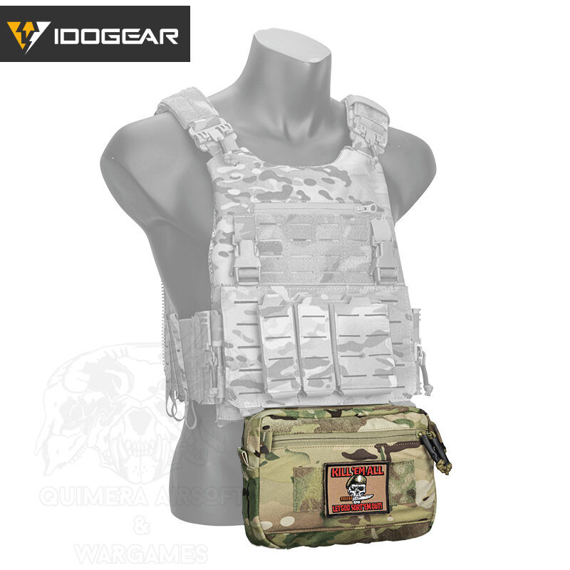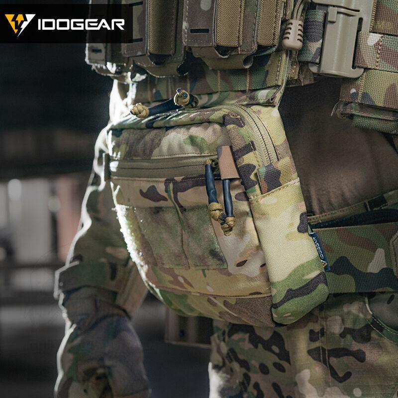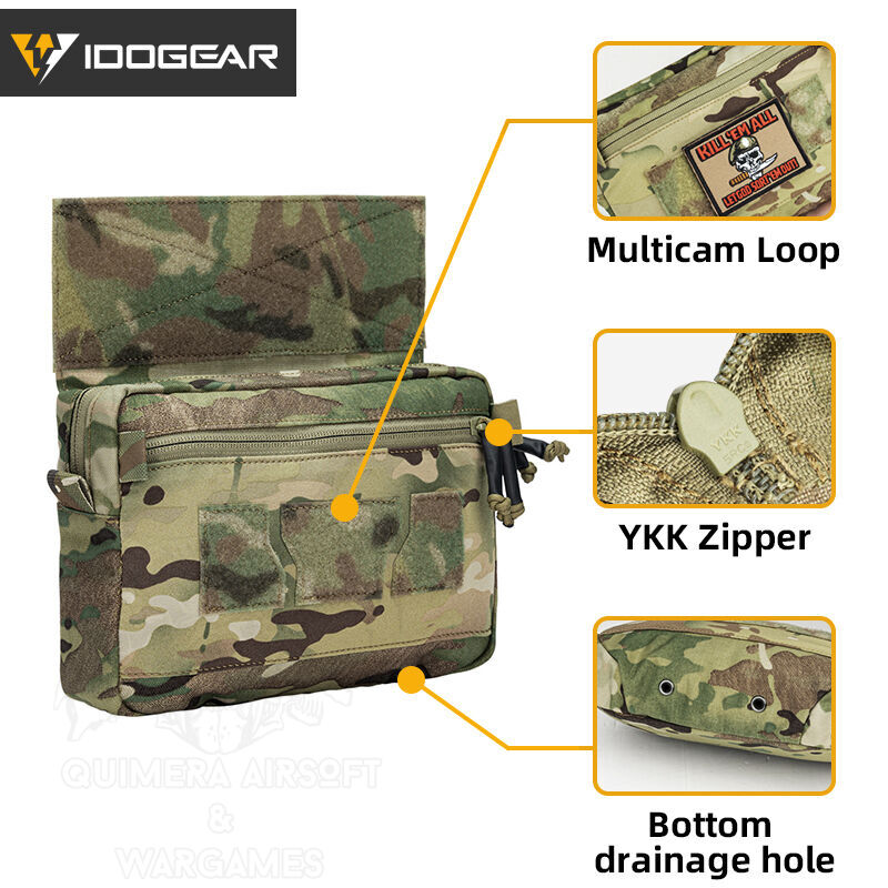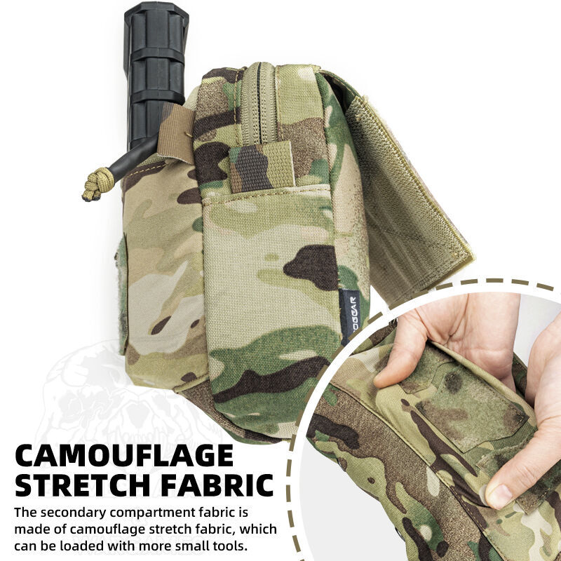 Un drop-down pouch es un pouch, que diferencia de la mayoría, no va sujeto mediante MOLE a nuestro chaleco, chest rig o primera línea. Gracias al velcro se suele colocar en la parte baja de los portaplacas o chest rigs; ganas a la vez que más hueco para guardar lo que necesites (una botellita de agua, el tabaco, un mechero, cargadores extra, alguna herramienta, el límite es tu imaginación) una protección extra a la zona baja del vientre. Además, tiene un panel de velcro para que puedas colocar tus parches favoritos. En su interior cuenta con varios loops para colocar todo aquello que llevas en su interior sin que se desordene lo que lleve ahi dentro. Incluye otro bolsillo mas pequeño, para aún mayor capacidad.