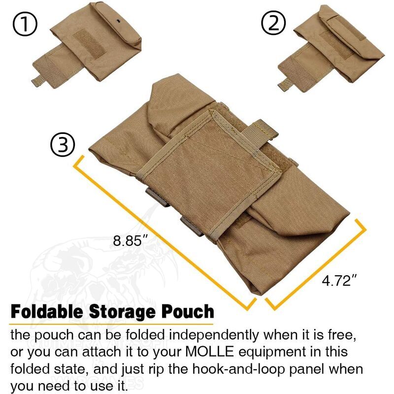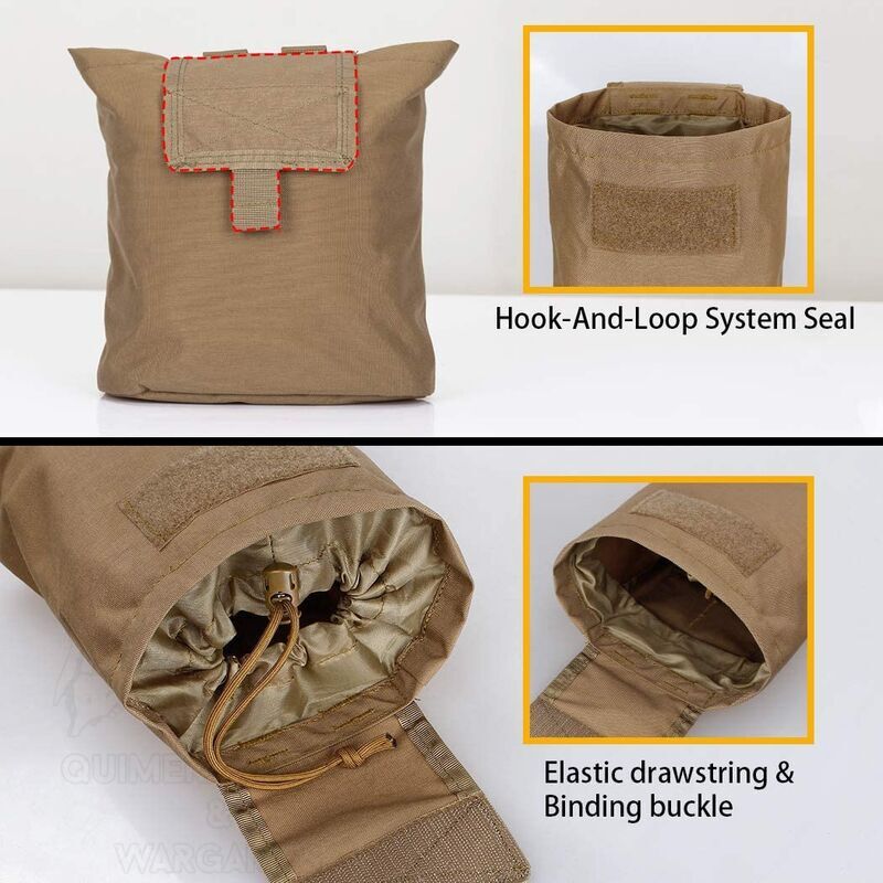 La característica principal de este pouch es su capacidad de plegarse cuando no está en uso, lo que la hace fácil de transportar y te ahorra mucho espacio cuando no lo utilices. La bolsa cuenta con un cierre con cordón ajustable para mantener tus objetos seguros y evitar que se caigan accidentalmente. También cuenta con un sistema de drenaje en caso de que necesites guardar objetos húmedos o sucios. Se puede colocar fácilmente en tu cinturón o chaleco táctico gracias a su sistema de enganche compatible con sistemas MOLLE. Esto te permite tener acceso rápido a tus cargadores vacíos u otros objetos sin necesidad de buscar en tus bolsillos.