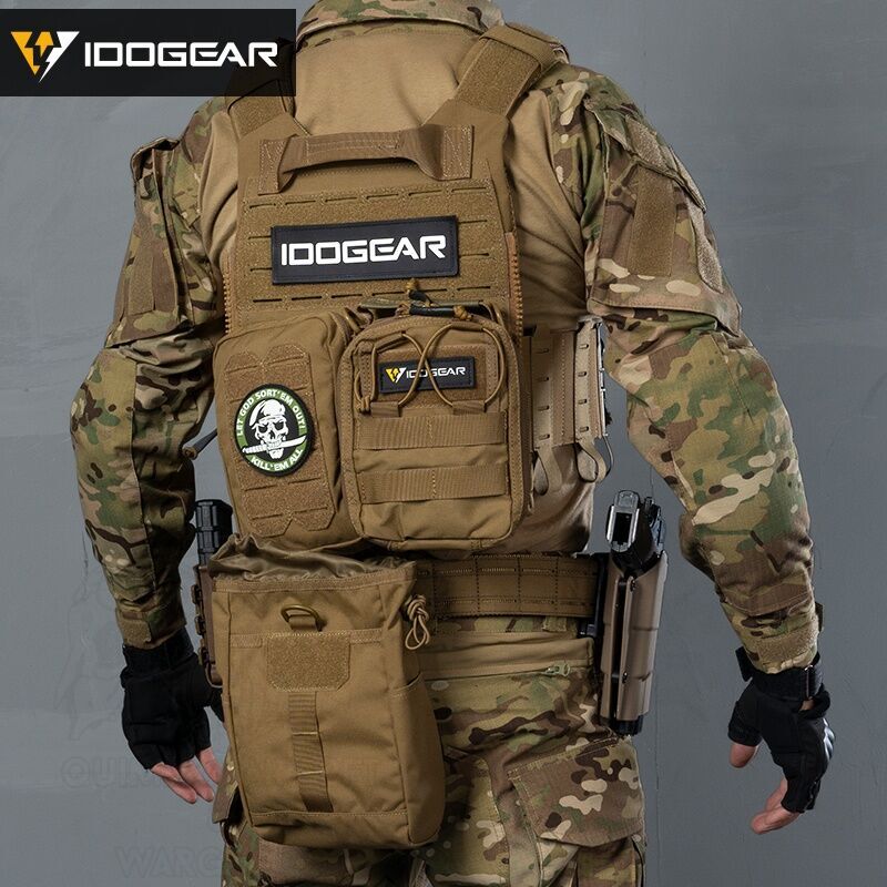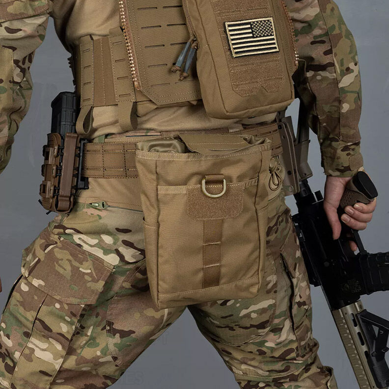 Si no sabes qué hacer con los cargadores vacíos, existe un tipo de pouch muy interesante para ti. Un drop pouch plegable. Que sea plegable te ahorra mucho espacio cuando no lo utilices. Pero una vez desplegado, aparte del típico bolsillo de gran capacidad, donde podrás poner cargadores vacíos u objetos de misión. Tienes dos bolsillos laterales y otro frontal con un D-ring para colgar la línea de vida o un mosquetón con los guantes.