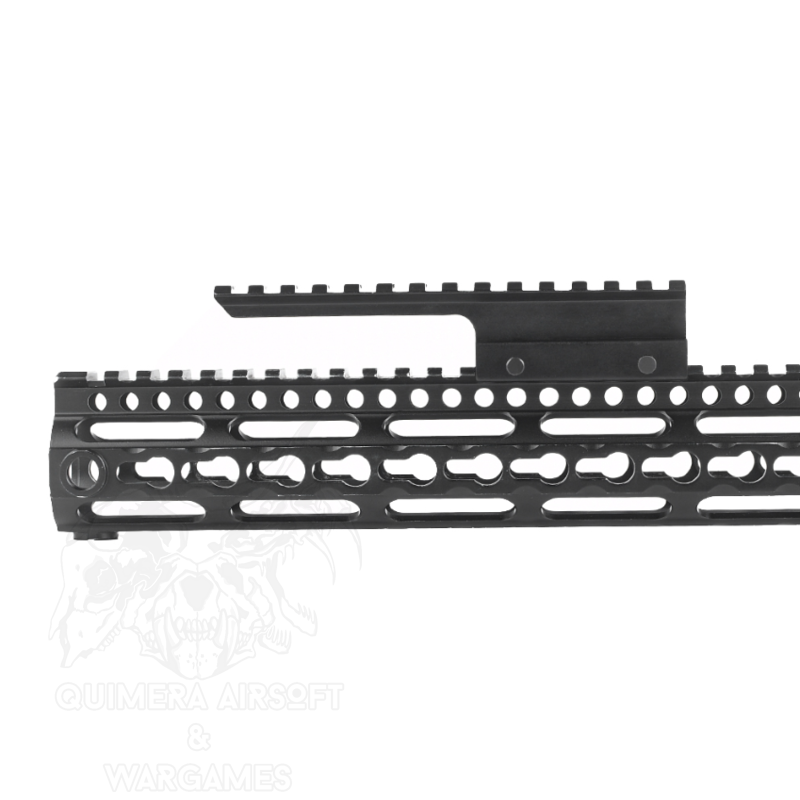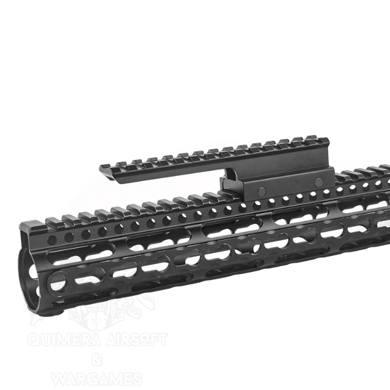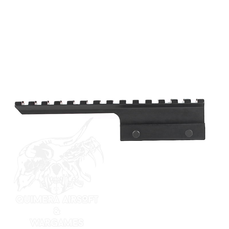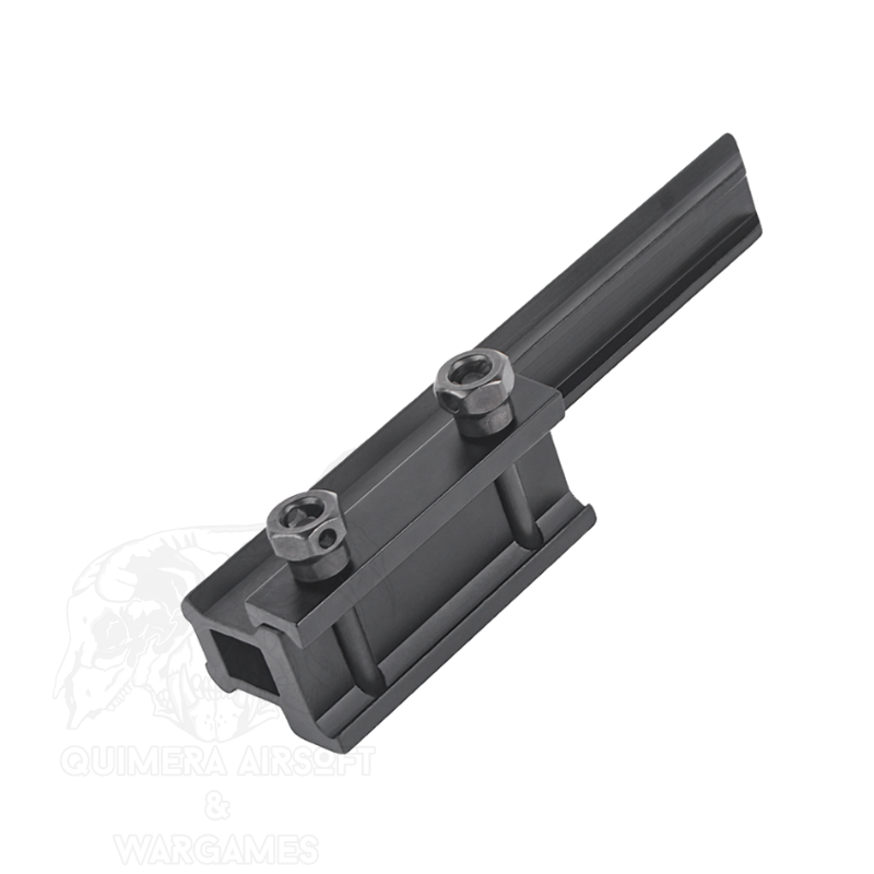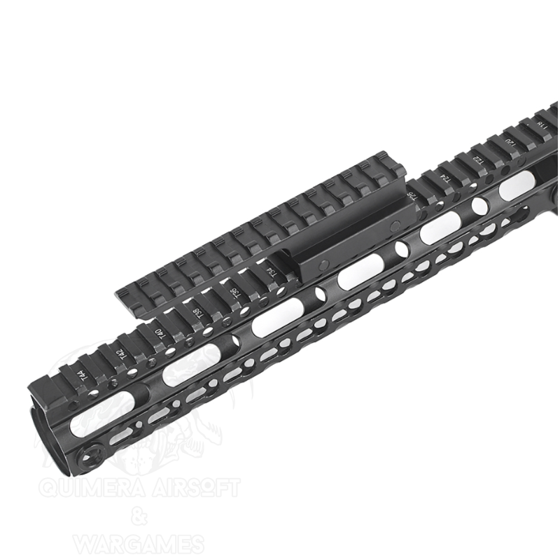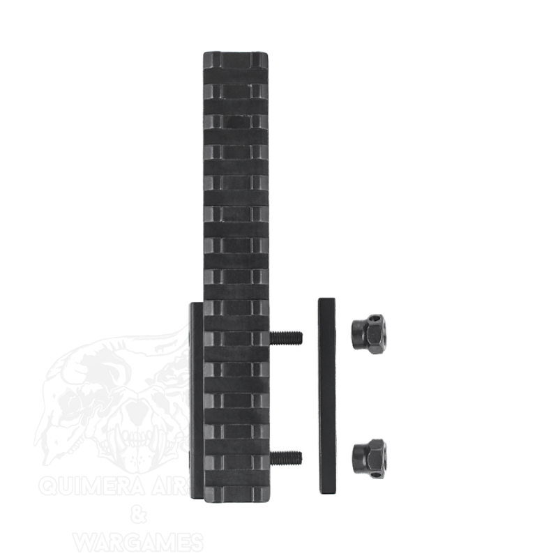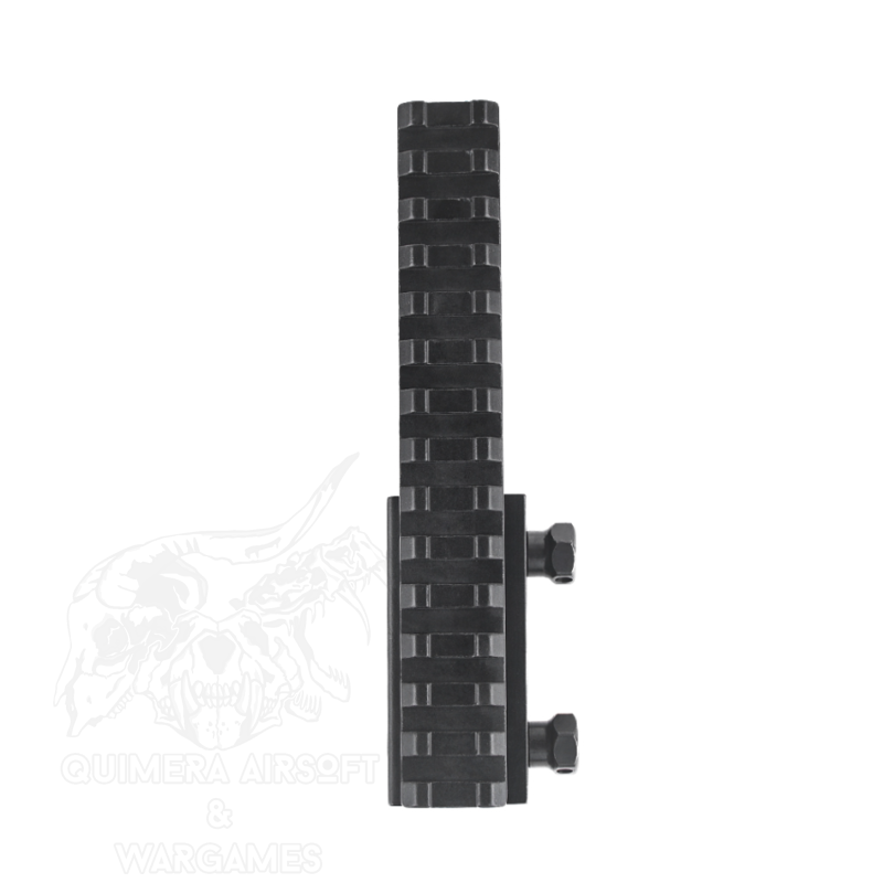 Un elevador de RIS Picatinny de unan pulgada y 14 slots de largo, para tener los accesorios más separado del cuerpo de la réplica. Algo muy útil si utilizas mascarás tipo FMA o morreras de rejilla. Y así encarar de manera más cómoda.
