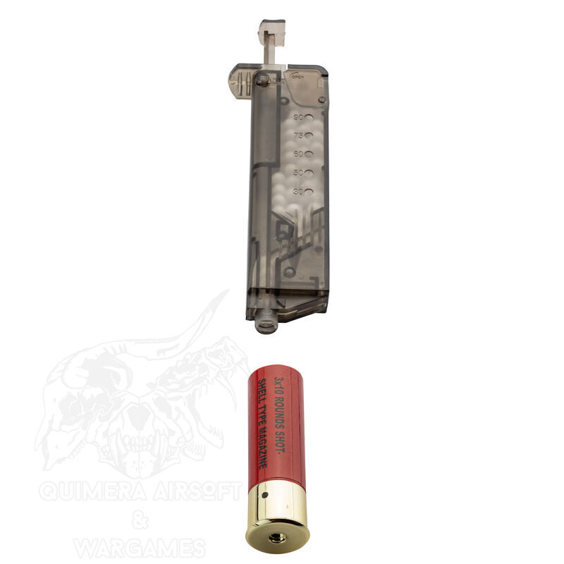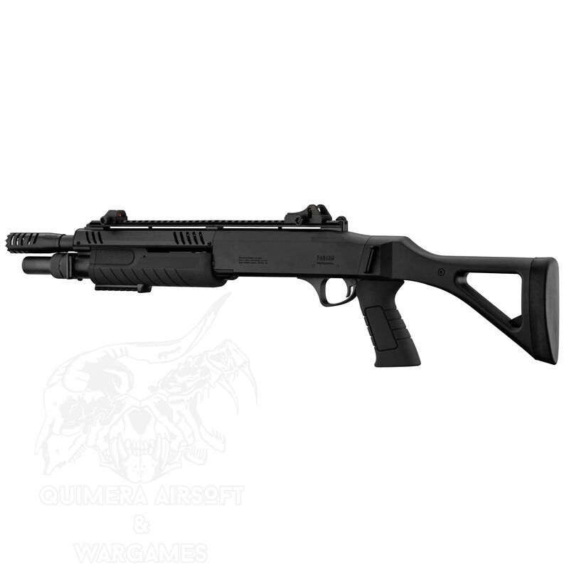 Con la licencia del fabricante italiano Fabarm os traemos una escopeta de muelle con capacidad de disparar tres bolas a cada disparo, fabricada en polímero ABS para una réplica superligera pero con una sensación de tener algo sólido y consistente entre las manos. Además, en la parte inferior puedes colocarle todo tipo de accesoris (grip para mejorar el amartillado, una linterna o un láser), gracias a su engomado en pistolete y laterales facilitará mucho la comodidad, agarre y amartillado.