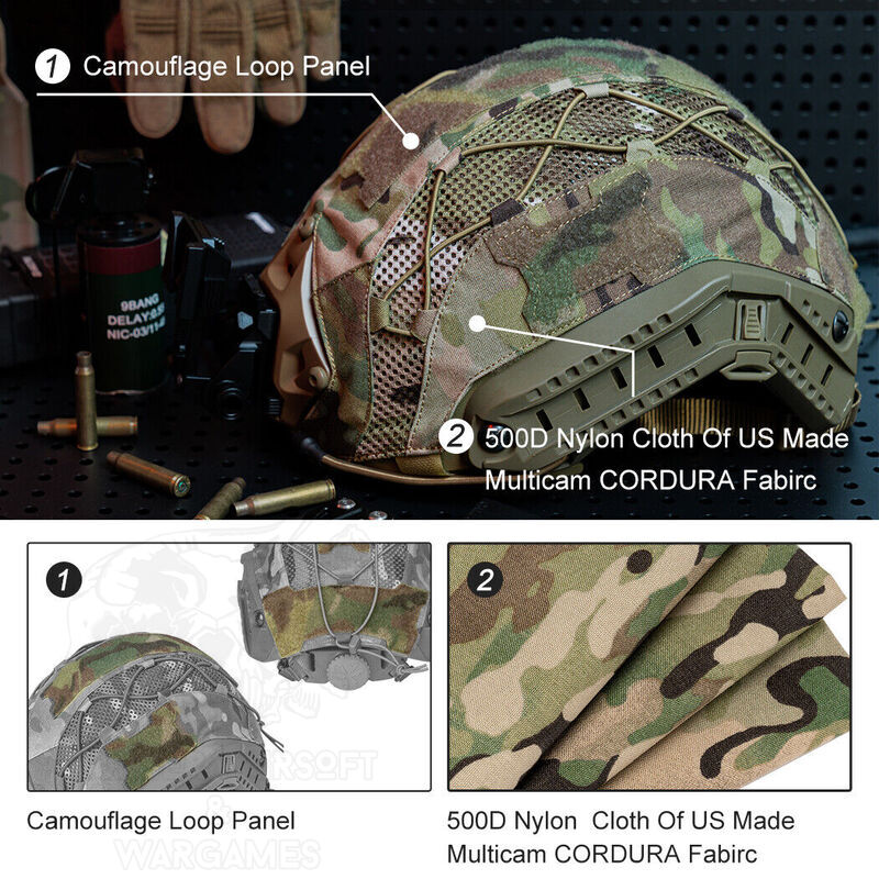 Funda para cambiarle el aspecto a tu casco en un momento y darle un aspecto más tacticool; la funda tiene diferentes zonas donde podrás acoplar diferentes parches, además de poder poner diferentes luces E lite light para señalizar que estás muerto o avisar a tus compañeros de tu presencia o incluso enganchar vegetación para romper tu perfil y mejorar tu nivel de camuflaje.