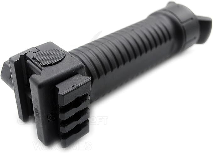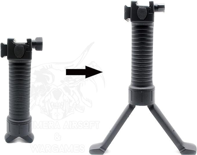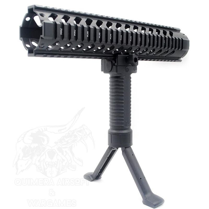 Dos accesorios al precio de uno, ¿qué más quieres? Bueno, el nombre ya describe muy bien que es. El Grip Vertical con Bípode Retráctil es un accesorio táctico imprescindible para mejorar la estabilidad, precisión y versatilidad al disparar. Su diseño ergonómico proporciona un agarre cómodo y seguro, permitiendo un control preciso del arma en diversas situaciones. El bípode retráctil integrado ofrece una plataforma sólida y estable para disparar desde posiciones estacionarias, como tiros de precisión a larga distancia o en operaciones de observación y espera. La capacidad de desplegar y retraer rápidamente el bípode con un simple movimiento permite una transición fluida entre disparos en movimiento y disparos desde una posición fija.