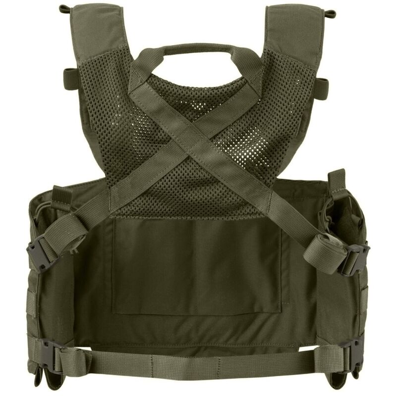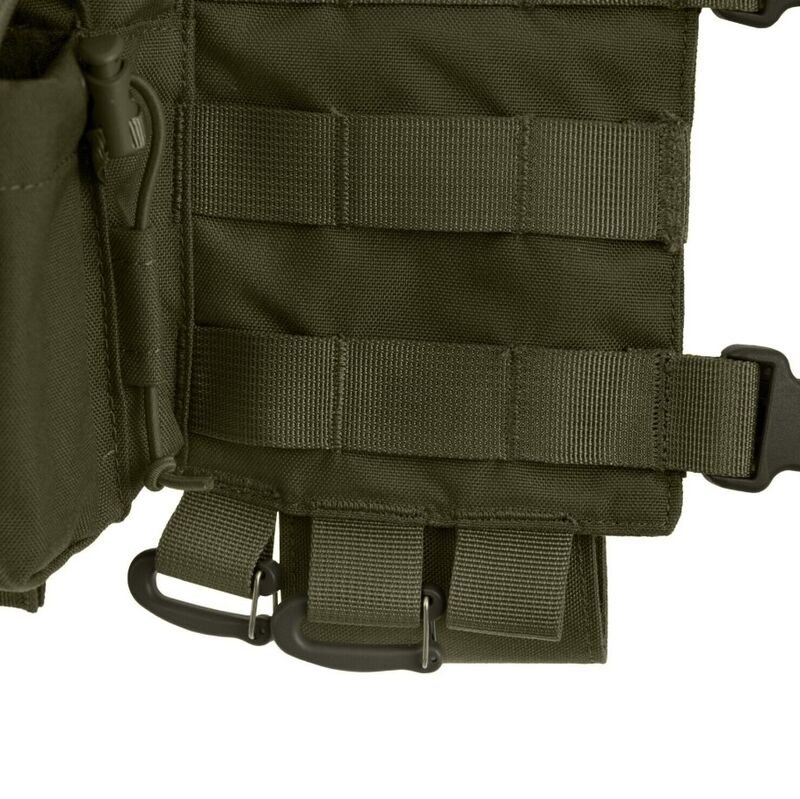 En los laterales del chest rig hay correas compatibles con MOLLE, ideales para añadir pouches adicionales. En su interior, incluye un gran bolsillo con cremallera, perfecto para mapas, cuadernos u otros accesorios. En el lado del cuerpo, el chest rig dispone de dos bolsillos planos diseñados específicamente para almacenar radios, ofreciendo una solución versátil y funcional para necesidades tácticas avanzadas.