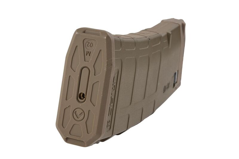 El cargador VMAG V3 de 30 BBs incluido destaca por su alta eficiencia de gas y su sistema de selección entre dry fire o retención del cerrojo en el último disparo.