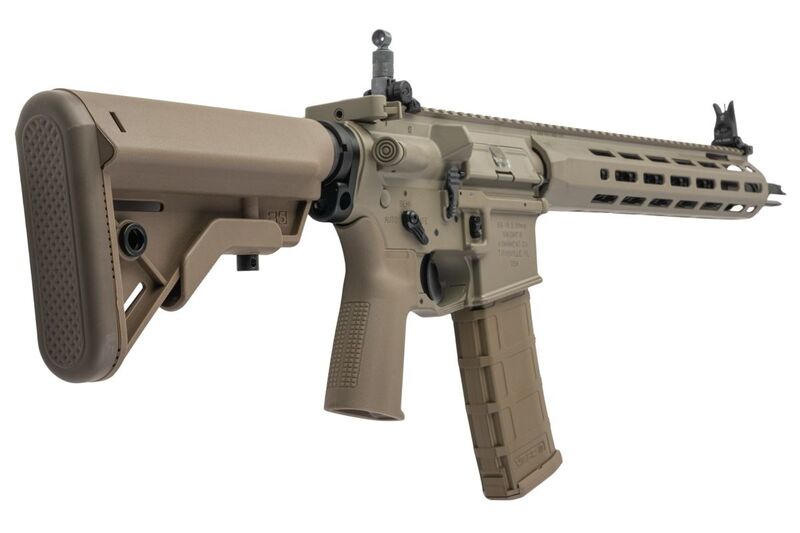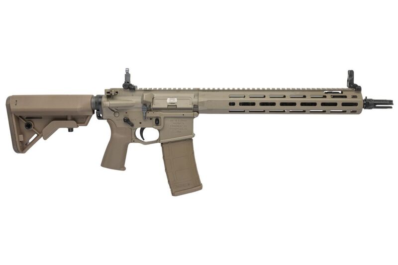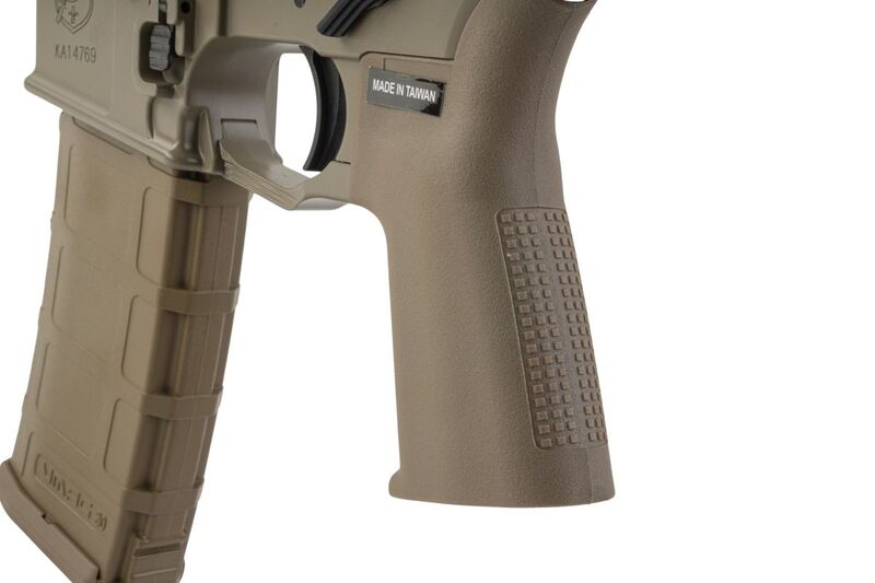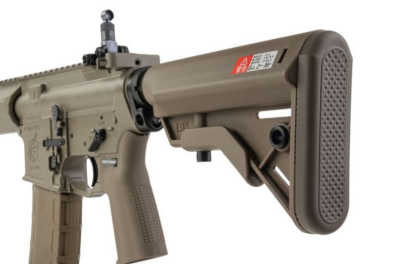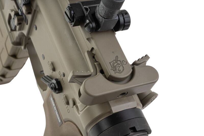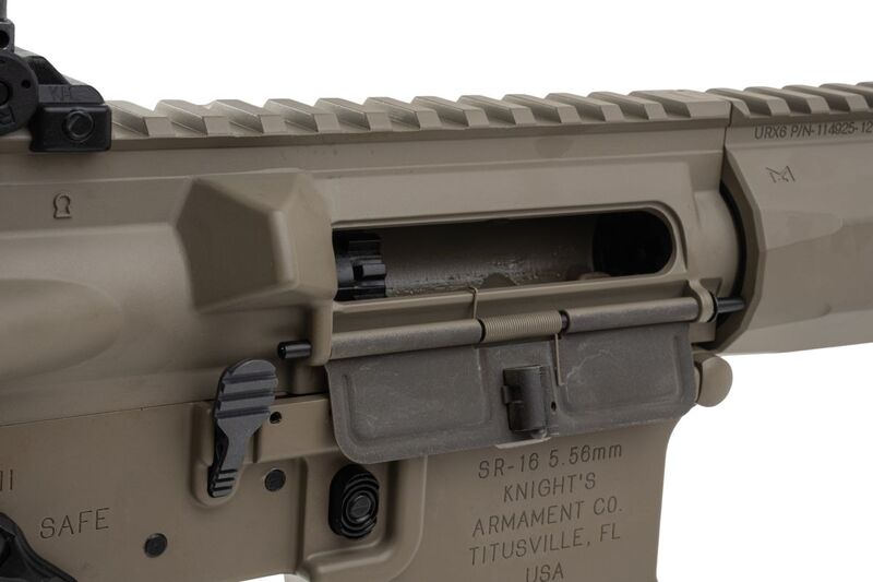El cuerpo está mecanizado en aluminio de alta calidad e integra el característico guardamanos KAC URX 6 M-LOK de 12,8”, junto a un rail Picatinny superior monolítico, permitiendo la instalación de ópticas y accesorios. El conjunto se completa con un cañón pesado dimpleado de 13,7”, exclusivo de este modelo.