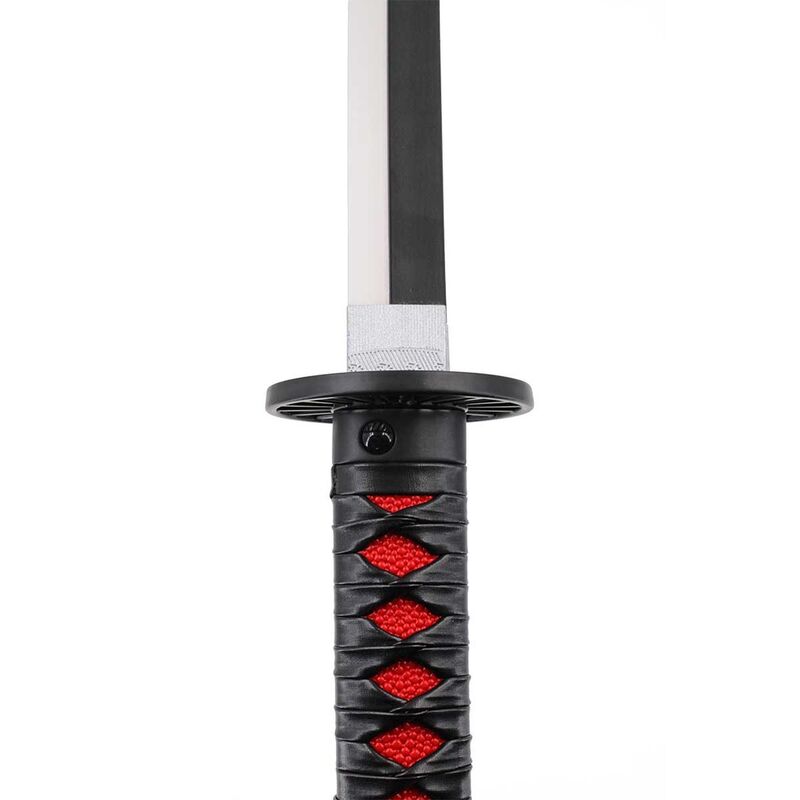 La tsuba, también en acabado negro y fabricada en aleación metálica resistente, mantiene el estilo característico del diseño original. La empuñadura (tsuka) está elaborada principalmente en madera y recubierta con piel sintética de raya, ofreciendo un agarre firme y cómodo además de un acabado visual muy cuidado.