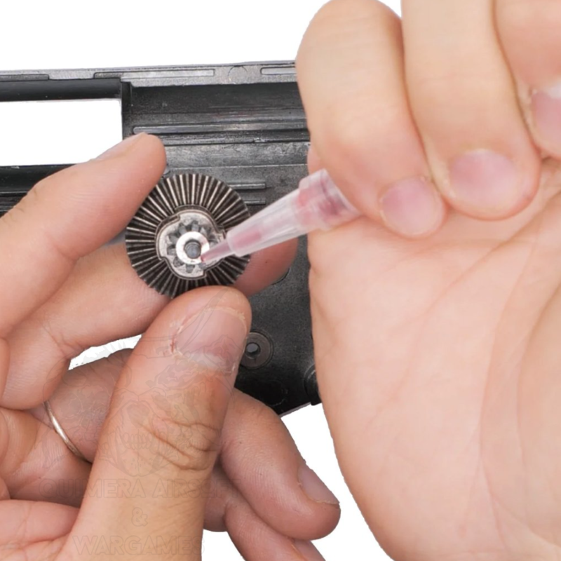 El aceite minimiza la fricción entre el contacto metal con metal, lo que lo hace ideal para el eje de engranajes en AEGs. La punta integrada es capaz de llegar a espacios delgados entre los engranajes mientras que la consistencia permeable del aceite le permite dejar una fina capa protectora y anti-fricción en cada superficie de desgaste, sin necesidad de desmontar demasiadas piezas. Lo que te evita la necesidad de desmontar toda la unidad del gatillo para mantenimiento.