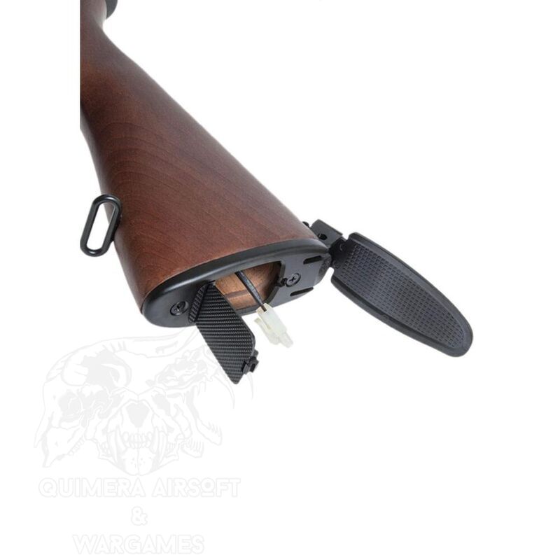 Lo más llamativo de este fusil es el receptor y la culata, que están construidos con su acabado en madera, que le confiere un aspecto auténtico y tradicional. Pese a este aspecto clásico; internamente está equipada con un sistema de gatillo electrónico (ETU) de G&G, que ofrece una respuesta rápida y una mayor eficiencia energética. Esto mejora el rendimiento de disparo y proporciona una experiencia de juego más suave y precisa.