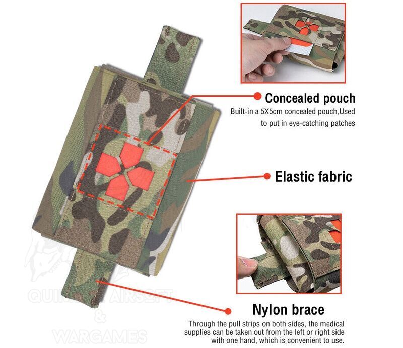 Cuando te dicen pouch médico, la imagen que se te suele venir a la cabeza es el de este producto, el pouch médico tipo TKN. Y seamos sinceros. En el cinturón táctico queda de locos y tiene su utilidad sin ocupar demasiado y los accidentes ocurren, por eso es mejor ir preparado. Idogear nos da un pouch donde llevar el IFAK (Individual First Aid Kit), ya sabes: vendas, tijeras, medicamentos, mercromina, tiritas, gasas, etc. Todo lo que necesites si te haces pupa, eso sí… no te emociones que el espacio es limitado. El pouch consta de dos tiradores para que hagas una extracción rápida por cualquiera de los dos lados del pouch.