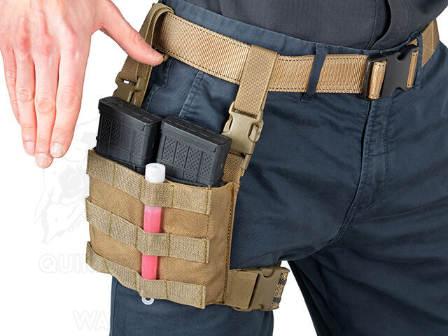 Siempre falta sitio en nuestra equipación donde poner un cargador extra o algún pouch tontorrón. Pues ahí es donde entra este panel para la pierna de 8Fields. Esta bolsa modular se utiliza para sostener municiones, cargadores y otros elementos esenciales. Está equipado con un bolsillo canguro para insertos elásticos de cargadores y cintas PALS para montar bolsas adicionales y fundas en el sistema MOLLE. Tiene tres correas de sujeción, 2 para el cinturón y 1 para rodear el muslo con una cinta de goma antideslizante para que el panel no se mueva mientras se desplaza.