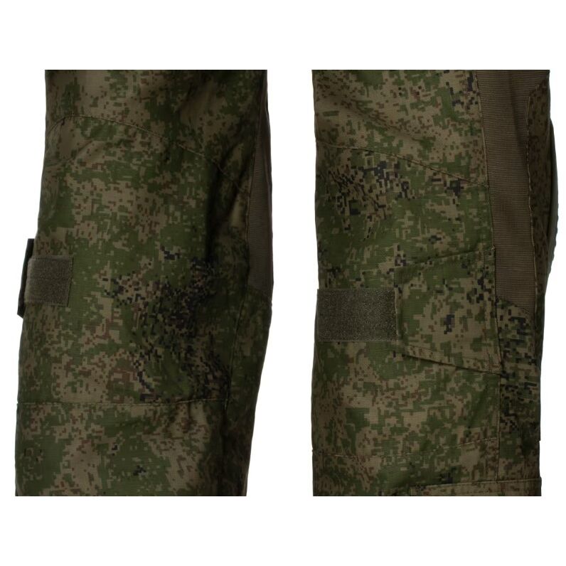 En el área debajo del cinturón y alrededor de las rodillas, se encuentra un tejido elástico para mayor comodidad y alta movilidad. Se incluyen almohadillas diseñadas para proteger las articulaciones al distribuir eficientemente la energía del impacto. Estas se ajustan perfectamente al usuario gracias al sistema de ajuste en el interior de los bolsillos superiores y las correas alrededor de las rodillas. Cuenta con varios bolsillos a su disposición: 2 abiertos en la cintura, 2 grandes bolsillos de carga en cada lado del muslo trasero con cierres de gancho y bucle, 2 bolsillos medianos en la parte delantera, 2 bolsillos pequeños en la parte inferior de la pierna y otros 2 bolsillos en la parte trasera de los pantalones.
