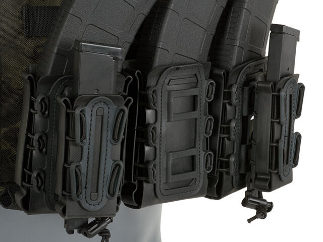 Este modelo incluye un sistema de clips de montaje, que permite conectarlo directamente a un pouch Soft Shell Scorpion para cargador de fusil, ampliando las opciones de configuración del equipo. Está diseñado para ser compatible con la mayoría de cargadores de pistola del mercado y es totalmente compatible con plataformas MOLLE.