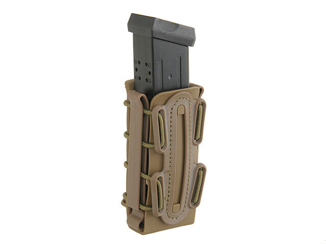 Gracias a los elementos de goma, el cargador permanece firmemente sujeto sin necesidad de cierres adicionales, mientras que la estructura de nylon rigidizado mantiene la forma del pouch y permite una inserción y extracción fluida del cargador. Su diseño open top lo convierte en una opción ideal para recargas rápidas.