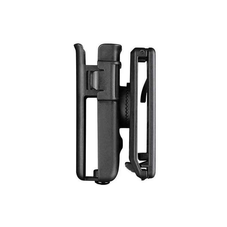 Porta cargador rígido universal fabricado en polímero de alta densidad, el cual se ensancha o estrecha gracias a dos tornillos con muelles, localizados en la parte superior y que podemos ajustar sin herramientas, con tal de alojar la gran mayoria de cargadores de pistola del mercado, como los de 1911, Hi-Capa, Glock, MK23, P-09, PPQ, etc. Incorpora una pinza regulable en ancho para poder llevarlo en el cinturón.