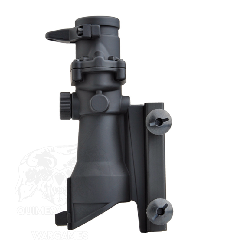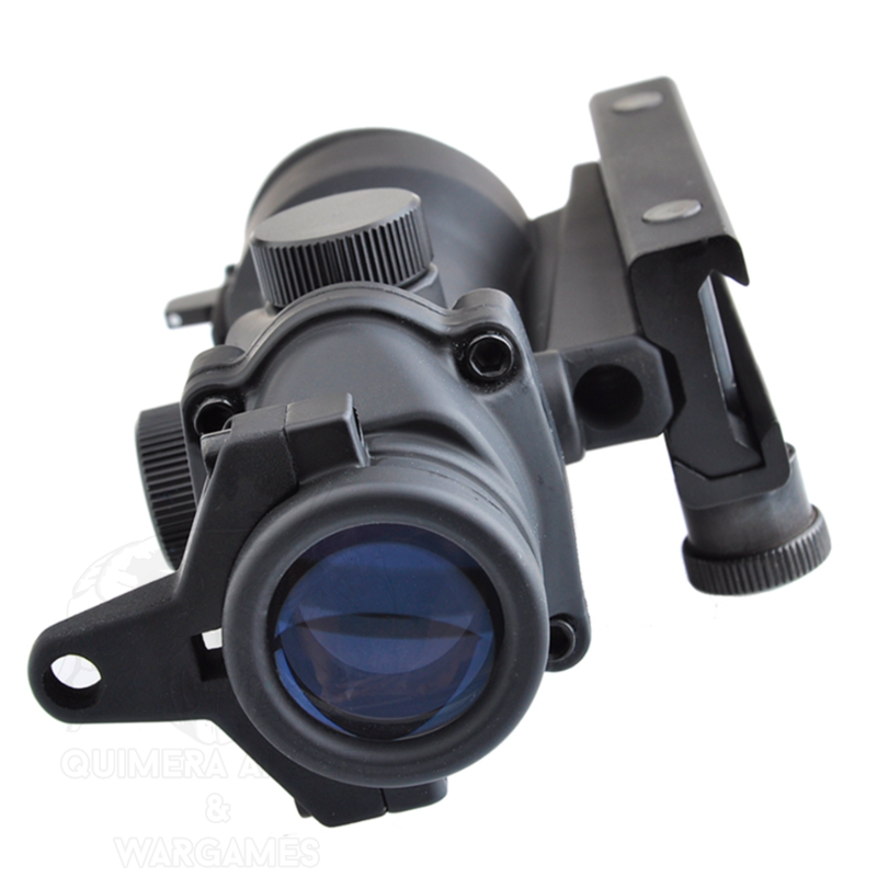 Aim-O nos trae una réplica del famoso visor ACOG que hemos visto en muchas series y películas. En este caso se trata del visor con 4 aumentos que funciona sin necesidad de baterías, ya que la cruceta está marcada en la óptica directamente. Además, si necesitas apuntar en cortas distancias, tienes una mira de hierro supletoria en la parte superior para no tener problemas de apuntado en CQB.