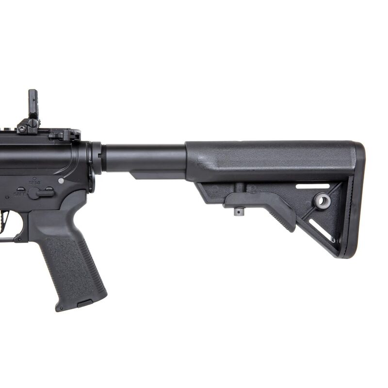 Este modelo E23 externamente está lleno de detalles que te van a flipar. Cuenta con una bocacha clásica de M4 tipo bird cage, un guardamanos con picatinny en el raíl superior, mientras que el resto de ángulos tienen MLOK que permiten un agarre más firme y cómodo y, ya que lo mencionamos la réplica incluye un grip angular y alzas tipo Specna para un mejor apuntado y ergonomía superior. Specna Arms además incluye un gatillo recto, un pistolete tipo K2 y una culata Crane para acabar de darle ese aspecto moderno y táctico.