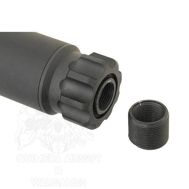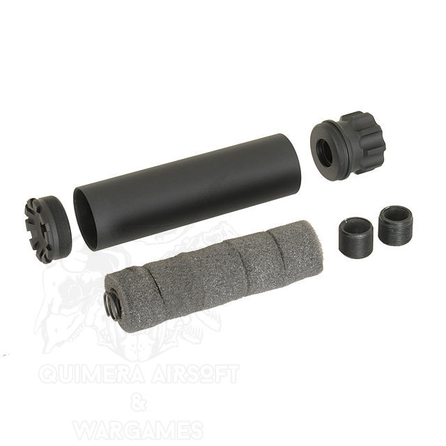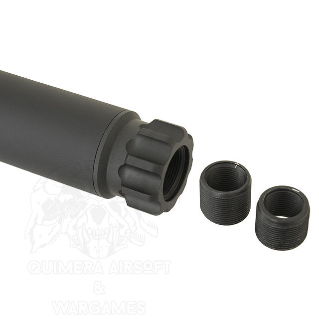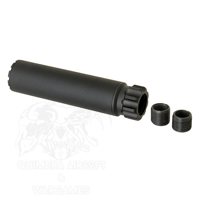 Se trata de un accesorio para darle un toque más táctico a nuestra réplica. Siempre y cuando dispongas de una rosca de 14mm, ya sea CW o CCW, ya que cuenta con dos rocas intercambiables. El silenciador está construido con materiales duraderos y de alta calidad para garantizar su resistencia y durabilidad en el campo de juego. Tiene una longitud de 152 mm y un diámetro de 35 mm.