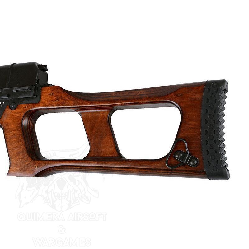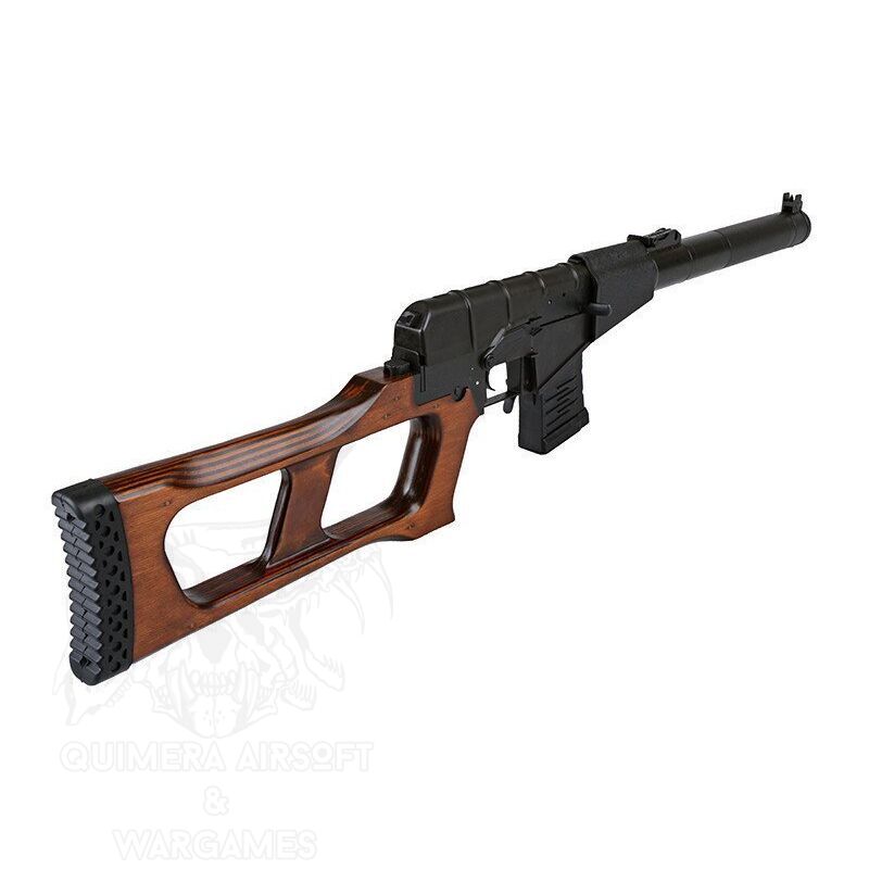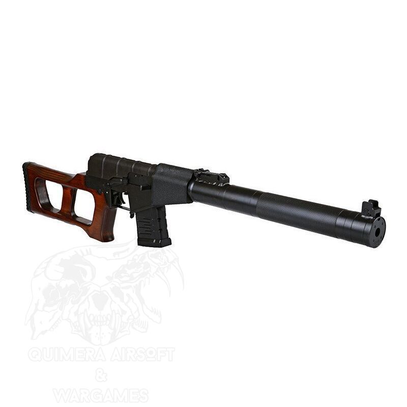Si quieres un DMR que gire todas las miradas, píllate el Vintovka Snayperskaya Spetsialnaya más conocido como VSS Vintorez. Fabricado por LCT es sinónimo de calidad. Se puede hacer un DMR temible de este rifle en las manos adecuadas, además de ser compatible con los cargadores de su versión de rifle de asalto(AS VAL). Principalmente suministrado a las unidades de Spetsnaz para operaciones encubiertas o clandestinas, un papel evidente por su capacidad de desmontarse para su transporte en un maletín especial. Si no quieres quedarte sin munición pilla los cargadores  AQUÍ   Características principales: Fabricante: LCT Peso: 3430g Largo: 895mm Cañon interno: 435 Materiales: metal, madera Calibre: 6 mm BBs Funcionamiento: Eléctrico Modos de disparo: Seguro / Semi /Full-Auto Gearbox: v3 Velocidad de salida aprox:  410 FPS Culata de Madera Incluye un cargador mid-cap 50bb's